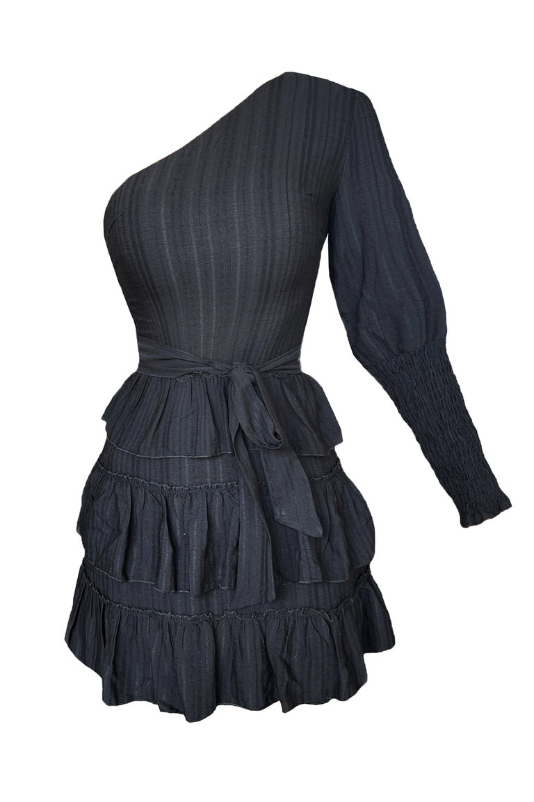 Siyah Tek Omuzlu Keten Volanlı Astarlı Mini Elbise